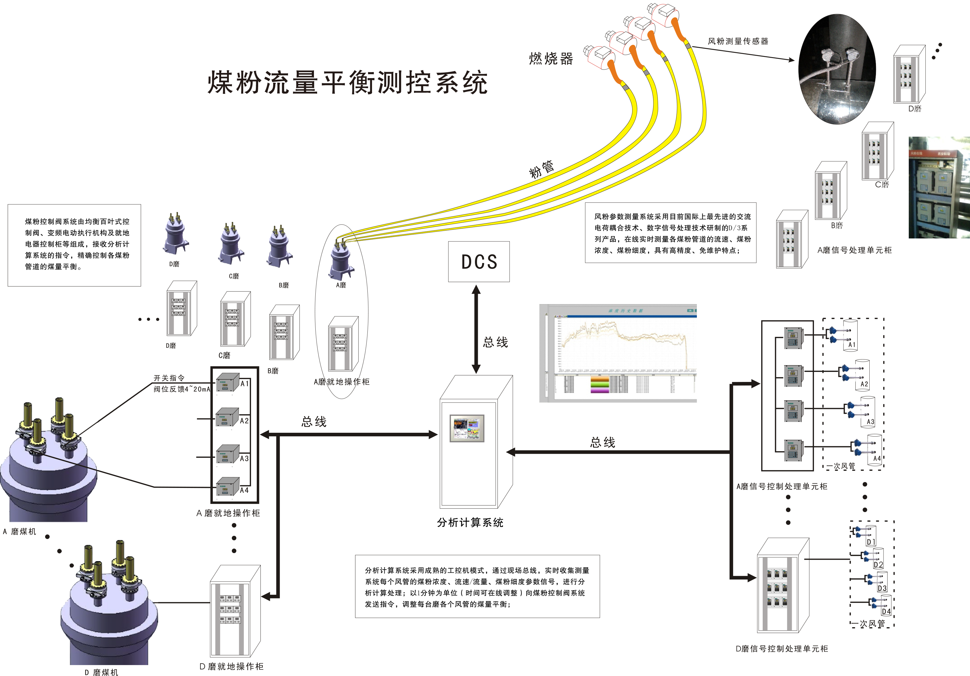 風(fēng)粉參數(shù)測(cè)量系統(tǒng)采用目前國(guó)際上最先進(jìn)的交流電荷耦合 技術(shù)、數(shù)字信號(hào)處理技術(shù)研制的 HA 系列產(chǎn)品,在線實(shí)時(shí)測(cè)量各煤粉管道的流速、煤粉濃度、煤粉細(xì)度,具有高精 度、免維護(hù)特點(diǎn); 分析計(jì)算系統(tǒng)采用成熟的工控機(jī)模式,通過(guò)現(xiàn)場(chǎng)總線,實(shí)時(shí)收集測(cè)量系統(tǒng)每個(gè)風(fēng)管的煤粉濃度、流速/流量、煤粉細(xì) 度參數(shù)信號(hào),進(jìn)行分析計(jì)算處理;以1分鐘為單位(時(shí)間可 在線調(diào)整)向煤粉控制閥系統(tǒng)發(fā)送指令,調(diào)整每臺(tái)磨各個(gè) 粉管的煤量平衡; 煤粉控制閥系統(tǒng)由均衡百葉式控制閥、變頻電動(dòng)執(zhí)行機(jī)構(gòu) 及就地電器控制柜等組成,接收分析計(jì)算系統(tǒng)的指令,精 確控制各煤粉管道的煤量平衡。